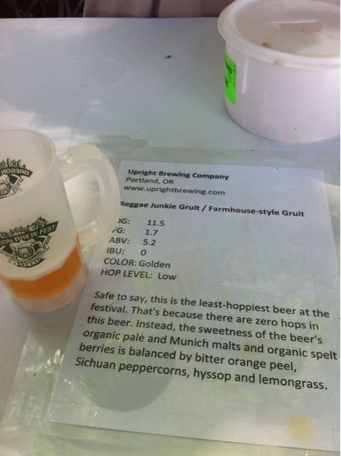 After yesterday, I wanted to make sure I tried beers from Oregon Breweries today (despite starting off with the Alaskan Barleywine). I had heard of Upright Brewing on an episode of Basic Brewing Video a few months ago, and, similar to the Midwest’s Jolly Pumpkin, they did mostly farmhouse style beers. I had also never tried a Gruit – a beer brewed with herbs instead of hops. Given that combination, it was one of my first stops of the day.