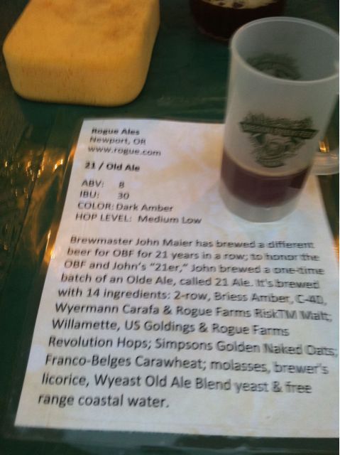 The Friday session of the Oregon Brewers Festival was drawing to a close, and it was time for one more beer before they stopped serving for the night. When I stopped by the Rogue hospitality suite earlier in the evening, they guys there told me that their “21” was brewed special for the Oregon Brewers Festival, and named because it was 21st different beer they had brewed for the festival. The olde ale included “revolution hops” grown at Rogue Farms.