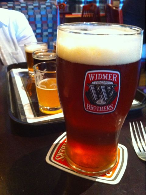 I was looking for something to do on Saturday morning before the Oregon Brewers Festival and the smoker at Full Sail Riverplace. When I attended the Brewmasters’ dinner, I got a chance to meet Kurt and Rob Widmer (the Widmer Brothers), and they recommended I stop by to take their brewery tour. Reservations were required, so I called and was able to get myself and my friend/coworker who lives there in Portland on the tour. As I mentioned in my last couple posts, this tour started with samples. The actual tour was fairly short and ended back at their restaurant/taphouse. It was the perfect time to grab a bite to eat before heading over to Full Sail Riverplace for the smoker. At lunch, I decided to try the Timbrrr Imperial IPA.