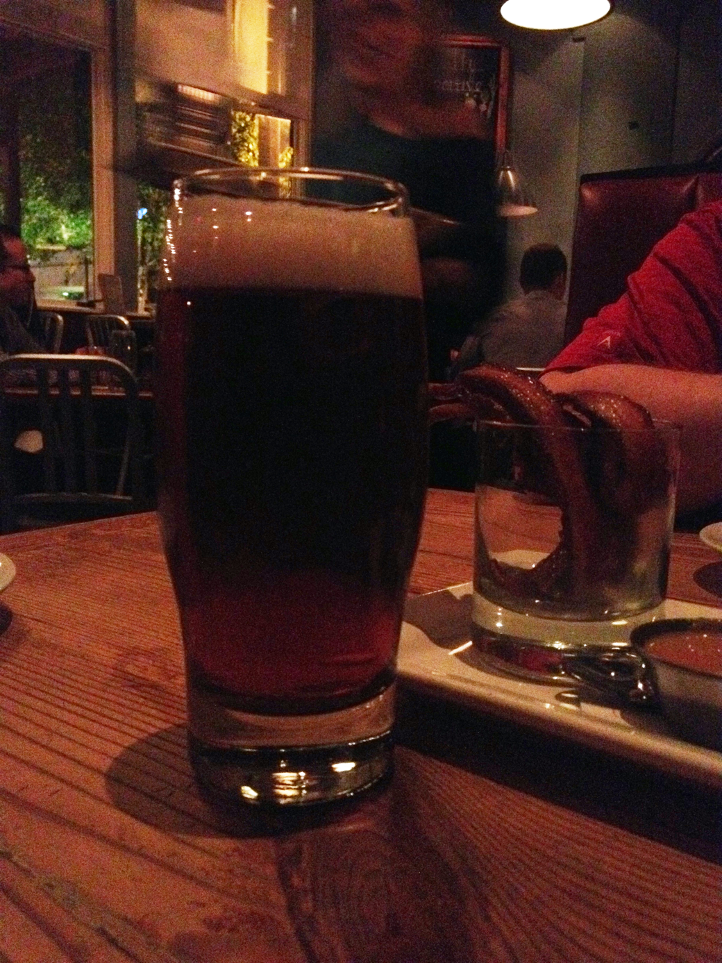 I’m out at dinner with my friend Joe, at Leon’s Full Service, a restaurant in Decatur, GA. We already hit the Wrecking Bar Brewpub earlier in the evening, so we’re doing pretty good. So we ordered an appetizer (seen here) of bacon and peanut butter (Joe tells me it’s a southern thing). Also, since I’m a pumpkin beer guy, I saw they had this one on tap, and it gave me a chance to try yet another brewer’s version of the style.
