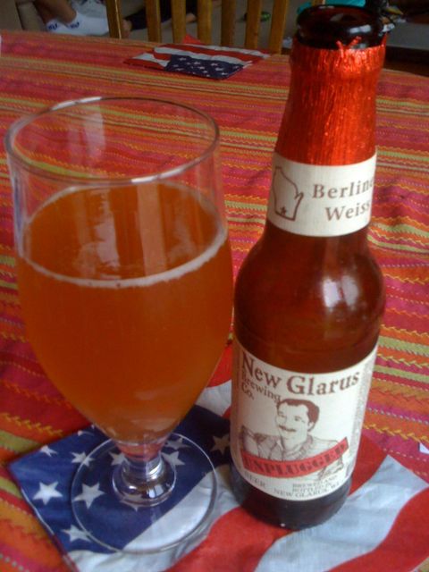 It’s a nice, hot, Fourth of July, so I wanted something light and refreshing. The New Glarus Berliner Weiss I got when I stopped by the brewery up in Wisconsin sounded like it would fit the bill. The bottle said, “a few times a year we will cut Dan loose to brew whatever he chooses, un-censored, un-cut, unplugged. Always hand crafted, the bottle you hold is brewed for the adventurous soul. This is a very limited edition and we make no promises to ever brew this style again. Napoleon hailed this tart beer style, ‘the Champaign of the North.’ A lively and elegant masterpiece this Berliner Weiss is a kaleidoscope of fresh flavor. Barrel fermentation, Pinot Grigio, Reisling grapes and Wisconsin White Wheat are bottle fermented with five proprietary yeast strains. A connoisseur’s rare jewel both spirited and subtle. Enjoy your sparkling toast under summer stars.”
