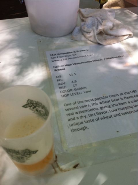 After visiting Mt. Hood in the morning and stopping at the Horse Brass Pub for a Mt. Hood Hogs Back Stout pulled from the cask, I headed back over to the Oregon Brewers Festival. As an occasional listener of The Brewing Network, I had heard of 21st Amendment and their Hell or High Watermelon Wheat beer. Since hearing about it, I wanted to try it just to see what it was like.