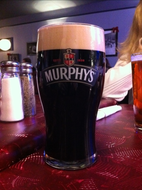 Murphy's Irish StoutWe had promised the kids earlier in the week that we would go out for pizza on Friday night and then drive around looking at Christmas lights.  We were not anticipating 4+ inches of snow to be on the ground by dinnertime.  We were able to talk them out of the usual Godfather’s pizza (they lover the ball pit), and went to Lucca Grill.  They have thin crust pizza and a decent beer selection.  However, the Murphy’s Irish Stout was the only beer on their list I hadn’t had yet.