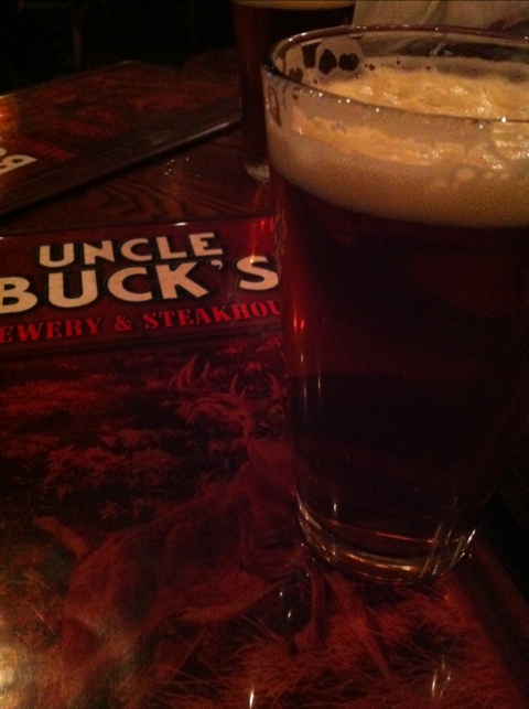 I’m traveling for work today, and will be right around the Dallas Fort Worth Airport (DFW) the entire 21 hours we’ll be in Texas. We arrived around 5:30 pm, and as Steve, my co-worker, and I have traveled together quite a bit, the first thing he did was search for the nearest brewpub to our location. He found Uncle Buck’s Brewery & Steakhouse just north of the airport in Grapevine, TX. It’s in a huge shopping center, focused around a Bass Pro Shop. The building the brewery & steakhouse was in was very impressive, as you can see here from the outside of the place. As usual, after traveling, we were both ready for a beer.