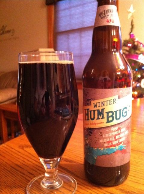 I bet my friend Betty from Portland on a basketball game – my Mizzou Tigers vs her Oregon Ducks – and won a bottle of local beer. She graciously mailed me this one (and a bag of Tim’s Jalapeno chips) right before the holidays. The bottle says, “The limited edition Porter with deep, dark character and rich malt flavor that will unravel your ribbons. 5.3% ABV” I figured what better time to have a beer named Hum Bug than the night before I have to go back to work.