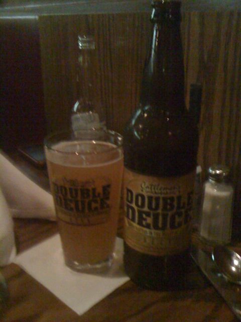 Tonight we arrived in Oklahoma City and immediately looked for a place to eat. After searching Urbanspoon and other sites, we settled on Cattleman’s. It is supposed to be a long-time local institution in the Old Stockyards district. That area, and the restaurant, had a lot of character. The inside of Cattleman’s was like stepping back to an old 1970’s style steakhouse. When I looked at the beer list, I had to laugh a little, since it listed Shiner Bock (Texas) and Boulevard Wheat (Kansas City) on the “Imports” list. One beer that stuck out to me, because the ad for it covered half of the beer page, was for the house beer – Cattleman’s Double Deuce, Brewed by Krebs Brewing Company.