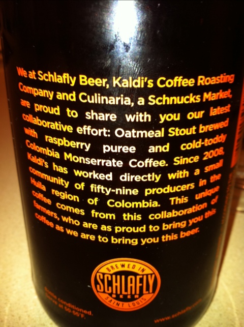 I found out about this beer a few months back from STLHops, and I knew I had to try it. St. Louis Brewery/Schlafly, makes a very good coffee stout (review coming soon), and I think it has a lot to do with the Kaldi’s coffee they use (and the cold steeping process for extracting the coffee flavors). I had never thought of a coffee-raspberry combination before, but once I had heard of it, I knew that it sounded pretty good.
