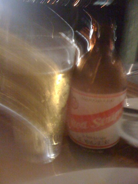 It was delivered in the bottle with a chilled glass, so I waited just a bit to let the glass warm up a bit. When I finally poured it, it was a very light yellow color and had a decent head which faded a bit. It seemed to be bubbling like crazy with carbonation, and it kept a pretty steady ring of bubbles around the top of the glass. Again, fighting off a cold, I wasn’t able to smell much – maybe a little bit of lager smell (maybe a bit of adjuncts, and a tiny sulfery smell).
