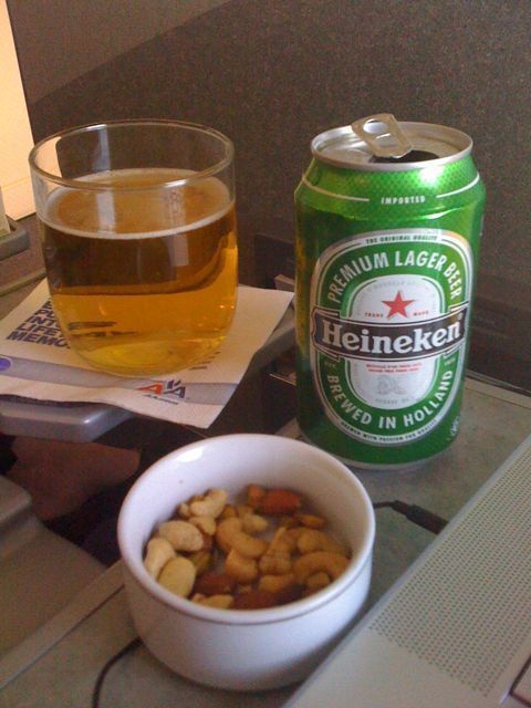 I really can’t thank my travel partner Steve enough for all the upgrades to first class. On our last day of travel, I again sat in first class on our flight from Tampa to Chicago. As I mentioned in my review of Budweiser, my choices on the flight were limited, so I thought I’d try Heineken – which I had never tried in the can – since it’s not something I’d probably pay for if I didn’t have to.