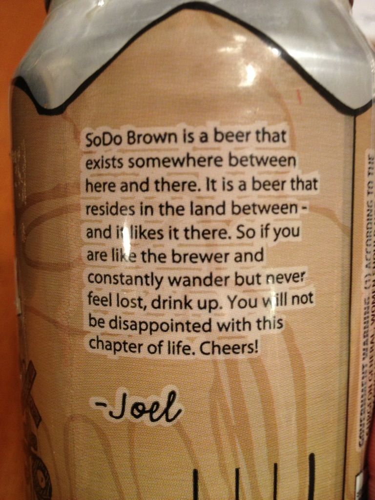 There’s no canned on, or enjoy before date on the can, but it says, “SoDo Brown is a beer that exists somewhere between here and there. It is a beer that resides in the land between – and it like it there. So if you are like the brewer and constantly wander but never feel lost, drink up. You will not be disappointed with this chapter of life. Cheers!”