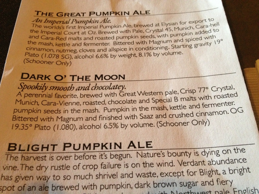 As I mentioned in my last post, when I reviewed Elysian’s Blight Pumpkin Ale, I’m in Seattle this week for work. My first stop after landing was Elysian, because it was between the airport and my hotel downtown. As a fan of great pumpkin beers, I tried to order their Great Pumpkin Ale, but they were out. So I went with their Blight Pumpkin Ale first. When it came time to order another beer with my meal, I went with this one since it also appeared to have a pumpkin connection.