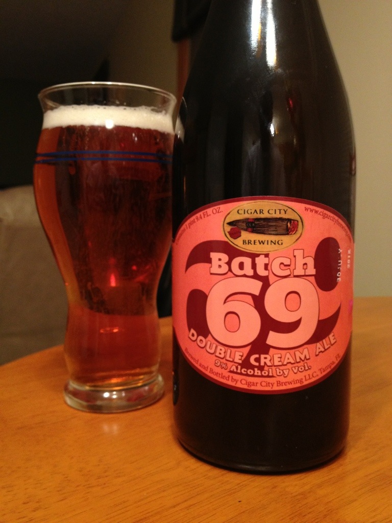 The bottle has a July 30, 2012 date on it, and it says, “Batch #69 is a Double Cream Ale, a style which isn’t really a style. This beer is our way of doubling the pleasure and doubling the fun. Originally brewed to celebrate the 69th batch of beer we brewed, the bottle in your hand is a nod to earlier, maybe slightly more immature days. We hope you enjoy a mouthful or two. ”