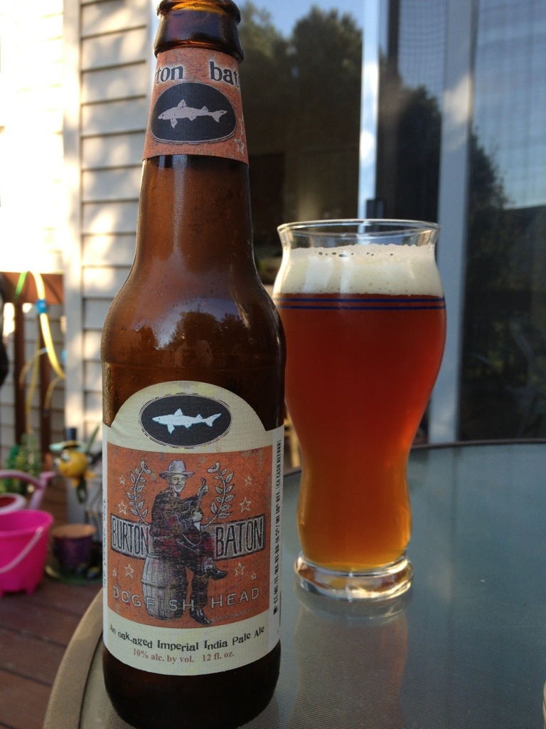 Its one of the first Saturdays that we have nothing we have to do, so my wife and I are relaxing on the back deck. The moment just called for a beer, so I reached into the beer fridge to see what I could come up with. This is one of the big beers my friend Travis gave me from his vacation to Virginia Beach about a month ago. I’ve been wanting to try this one for a long time… ever since I homebrewed my own wood aged IPA. To be honest, mine wasn’t very good at first, but after a year or two of aging, it was great. The bottle says, “This special ale is a two-thread blend of young & wood aged Imperial IPA.” It has a bottled on date of 3/4/13.