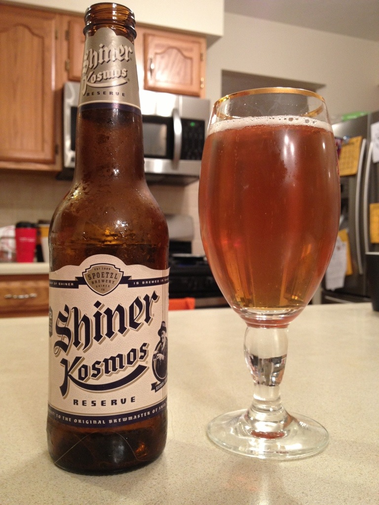 It’s Thursday night and we’re back from baseball practice. I was looking for a lighter, but still flavorful, beer as a refreshing relaxer. I find that Spoetzl’s Shiner beers usually fit that category, so I thought I’d give this one a try. I believe I got this beer from my friend Betty, as part of a mixed six-pack of Shiner beers when she moved from Austin last year.