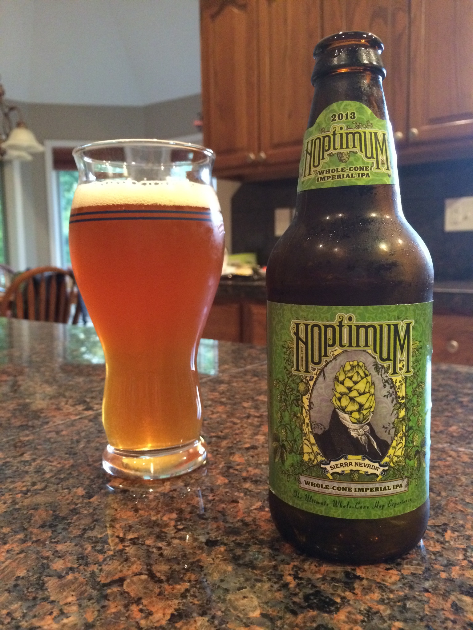 Well, today I announced that I got a new job to some people at work. I start my new job in about two weeks and an really looking forward to the new adventure. After cleaning up the kitchen tonight after dinner, I decided to sit down and do a beer review. I don’t remember exactly where I got this beer, but I put it in the fridge a couple months ago with the intention of drinking it soon. I’m glad I finally got around to it. The label says, “Hoptimum is the biggest whole-cone IPA we have ever produced – a 100 IBU, whole-cone hurricane of flavor. Aggressively hopped, dry-hopped, AND torpedoed, Hoptimum delivers ultra-intense flavors to hop fanatics everywhere.”