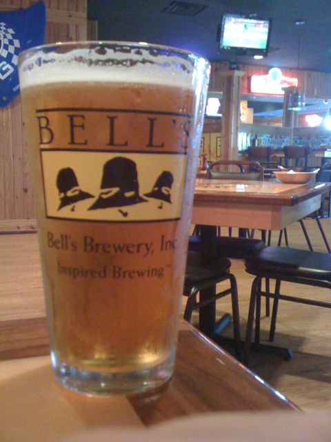 With my parents in town for the long holiday weekend, we decided to go out to eat tonight. My mom is a huge St. Louis Cardinals fan, so we had to find a place that had the game on. I had only been to Wings Etc. here in town once before and was not very impressed. Well, tonight was no exception… There were no beer list at our table, and when I asked the waitress what was on draft she said, “Coors, Miller Light, Bud Light, Fat Tire, no wait, we just ran out of that… well, we’ve got a bunch of other stuff.” So, I thought I’d go up to the bar to take a look myself, and I was delighted to see they had Bell’s Two Hearted Ale on draft.