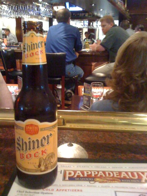 We just finished up a morning of work in Houston and lugged about 300 lbs of video gear with us through the airport.  After checking the gear, we headed to lunch at Pappadeaux Sea Food House in Houston Hobby Airport.  Out of breath, I immediately ordered a Shiner Bock.  I didn’t even bother pouring it in a glass, I was just ready for a clean refreshing beer.