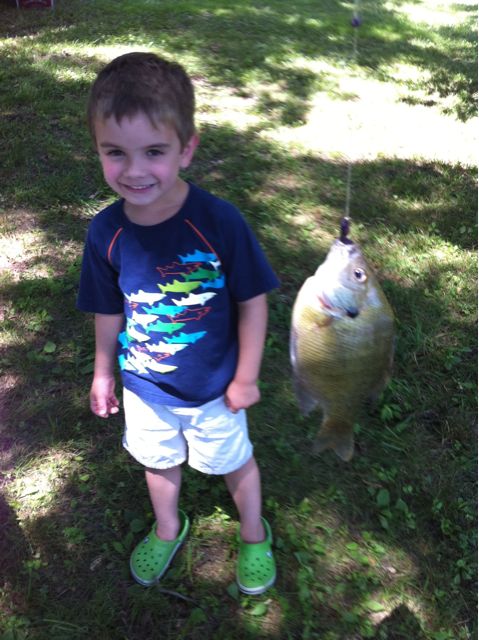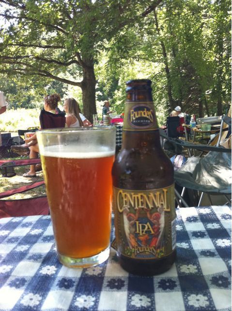 We had our homebrew club picnic today at the hideout of one of our club members. It’s in the middle of nowhere, but it is a great place with a small pond, a big grill, and a little cabin. The pond is stocked with big fish, which my son and I enjoyed catching most of the afternoon (at least when we weren’t swimming or paddling around in the canoe). You can see the photos below. When we stopped for lunch, it was the perfect time to take a break from sampling others’ homebrew and break out the Founder’s brew I brought for the afternoon. The bottle said it had 65 IBU’s and was 7.2% ABV.