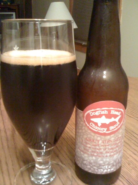 Dogfish Head’s Chicory Stout says that it’s “a rich dark brew smoothed out out with a touch of roasted chicory and organic Mexican coffee goodness and carries a bone white head.” It says that it is 5.2% alcohol by volume.